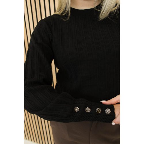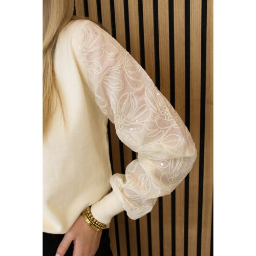 Een fijngebreide truitje met lurex (glitter) in verwerkt. Deze heeft knoopjes en volant mouwen. Heel erg leuk te combineren voor een feestelijk gelegenheid of straks met de feestdagen voor op een pantalon of rok!