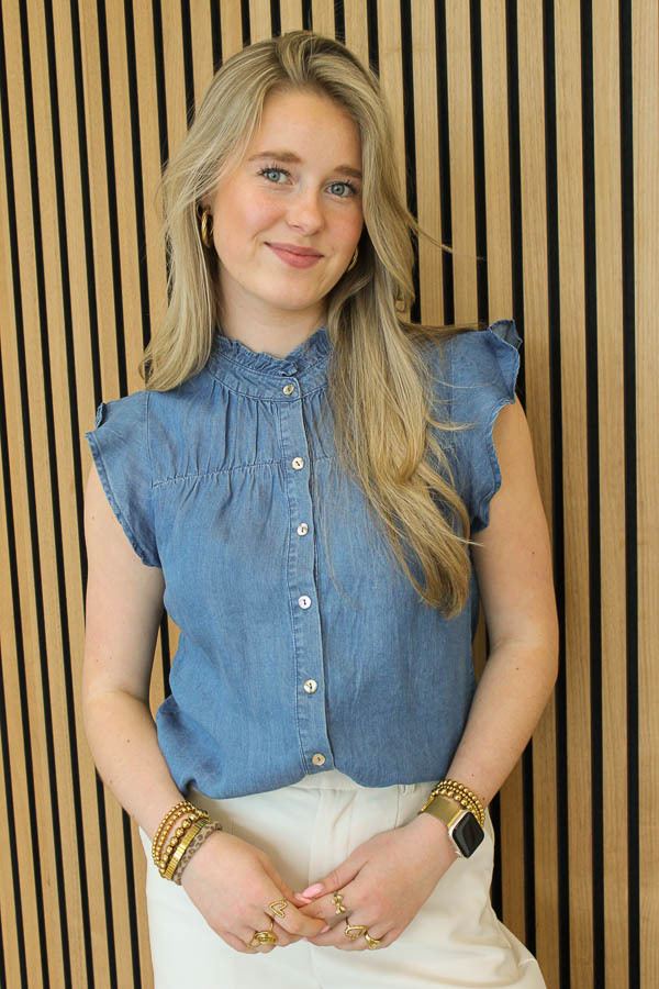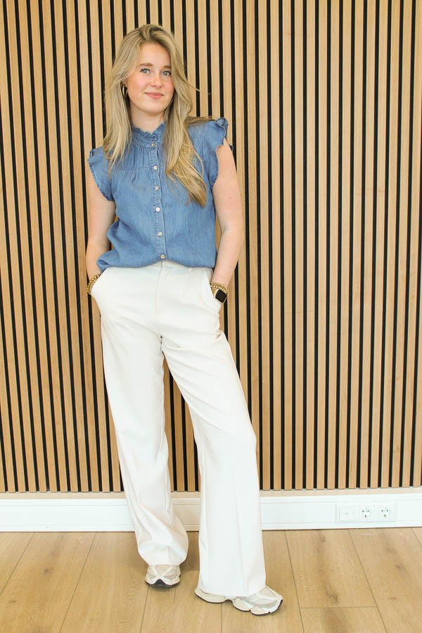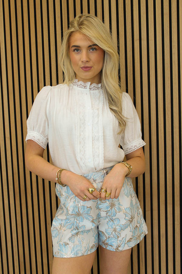 Zomerse blouse met broderie en kant. Deze heeft korte mouwen en is zowel casual als chique te combineren.