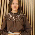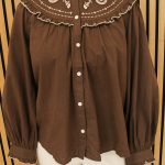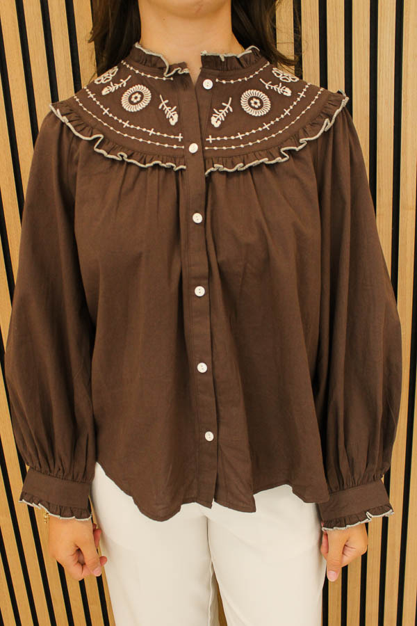 Mooie blouse van katoen met hoge hals en broderie met mini volantjes. Erg leuk een een trend uit de winkel! In onze favouriete kleur choco bruin én in marine blauw.