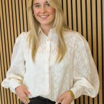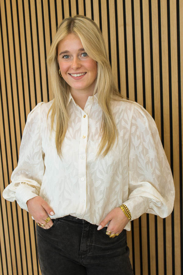 Gave blouse met kraag en lange pofmouwen. Deze blouse heeft motief van bladprint in en dat is zo leuk/speels. Wij hebben deze in meerdere kleuren in onze collectie.