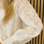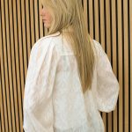Gave blouse met kraag en lange pofmouwen. Deze blouse heeft motief van bladprint in en dat is zo leuk/speels. Wij hebben deze in meerdere kleuren in onze collectie.