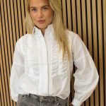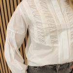 Een prachtige blouse met ruffels aan de voorkant en pofmouwen. Deze blouse valt los al heel mooi en heeft achterkant iets langer. Ook leuk te combineren met onze gilets!