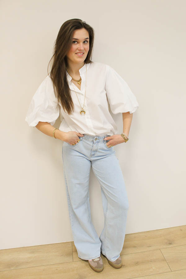 Deze mooie pofmouwen blouse heeft een vrouwelijke en elegante uitstraling. De luchtige stof maakt de blouse comfortabel om te dragen en perfect voor zowel casual als geklede looks.
