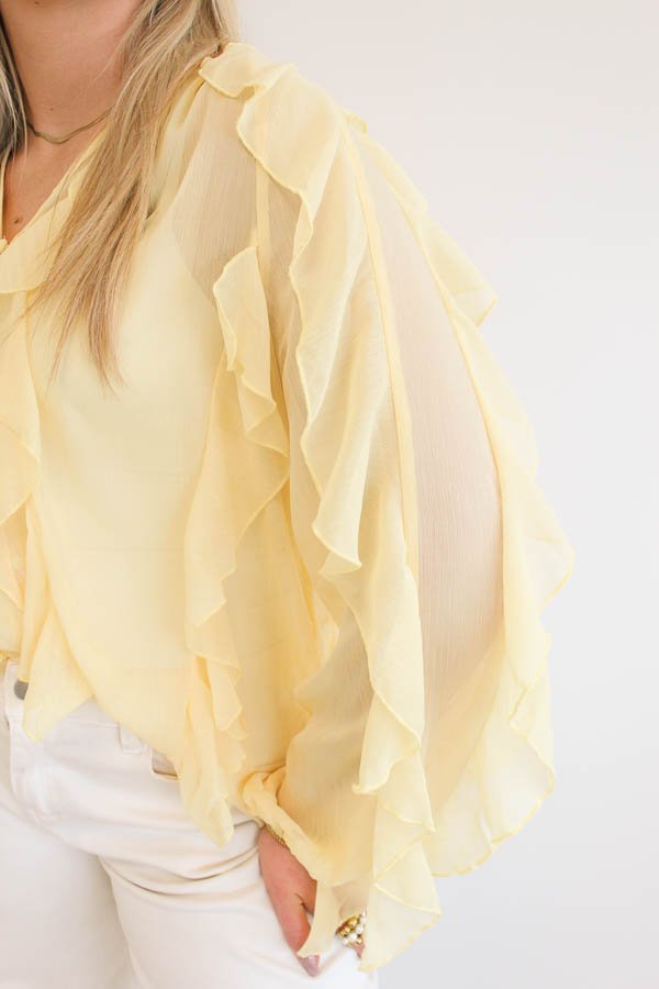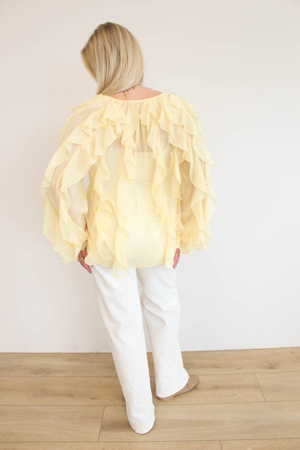 Een geweldige blouse met ruffels en een knoopsluiting aan de voorkant. De licht doorschijnende stof geeft de blouse een elegante en vrouwelijke uitstraling. Perfect voor een stijlvolle en luchtige look.