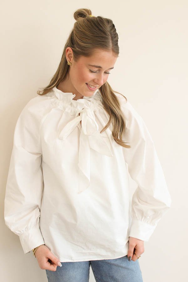 Een hele mooie blouse met een elegante strik aan de voorkant voor een vrouwelijke uitstraling. De blouse heeft nette manchetten en een speelse ruffelkraag die zorgt voor een verfijnd detail. Perfect voor een stijlvolle en elegante look.
