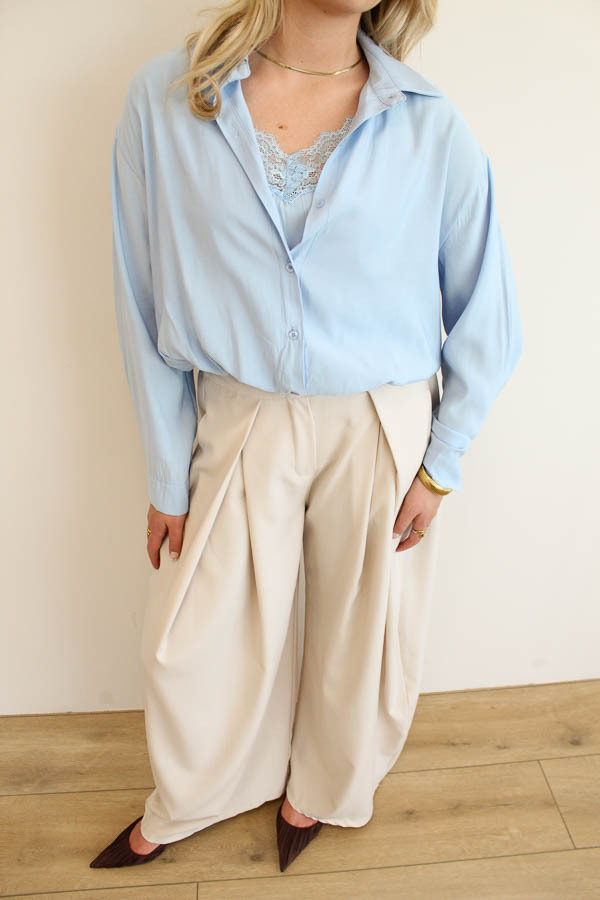 Blouse met een gepofte onderkant door het elastiek, wat zorgt voor een speels effect. Het hemd zit er vast in voor extra comfort en een mooie pasvorm en kanten randje. Gemaakt van een soepel en luchtig stof die perfect is voor de lente! Shop ze nu in meerdere kleuren!