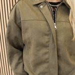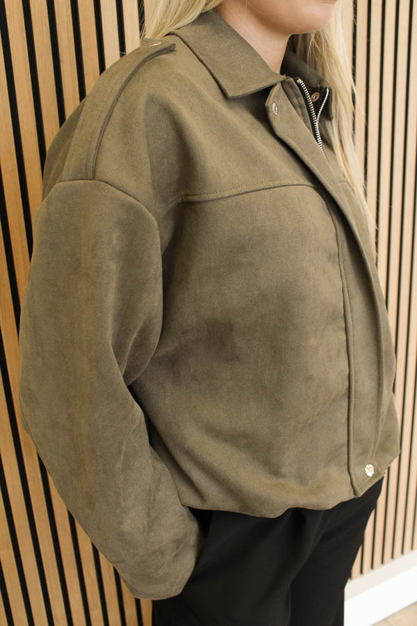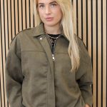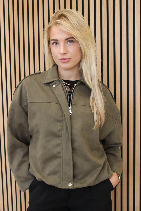 Deze stijlvolle jas van faux suède is een must-have voor het najaar! De khaki groene kleur straalt klasse en rust uit, terwijl de decoratieve schouderbanden en rits een stoer, modieus accent geven. Dankzij de losse pasvorm zit de jas heerlijk comfortabel en is hij perfect te combineren met al je herfst- en winterlooks.