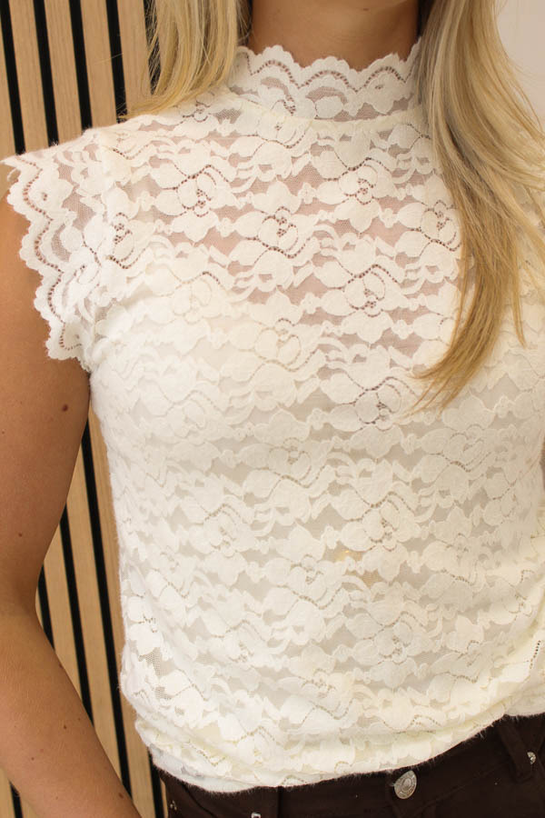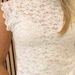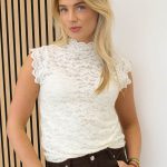 Een kanten top met col én semi-transparante stretch stof. Deze is perfect voor onder een blazer of jasje. Leuk voor een feestje om zo te dragen!