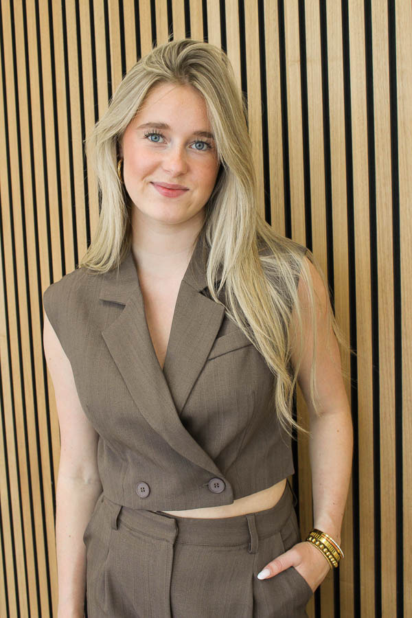 Gave cropped gilet die goed aansluit en super leuk staat op een broek met hoge taille of een rok kan natuurlijk ook! Deze matcht perfect met de bijpassende pantalon Malou marine voor dames die het liever als set dragen!