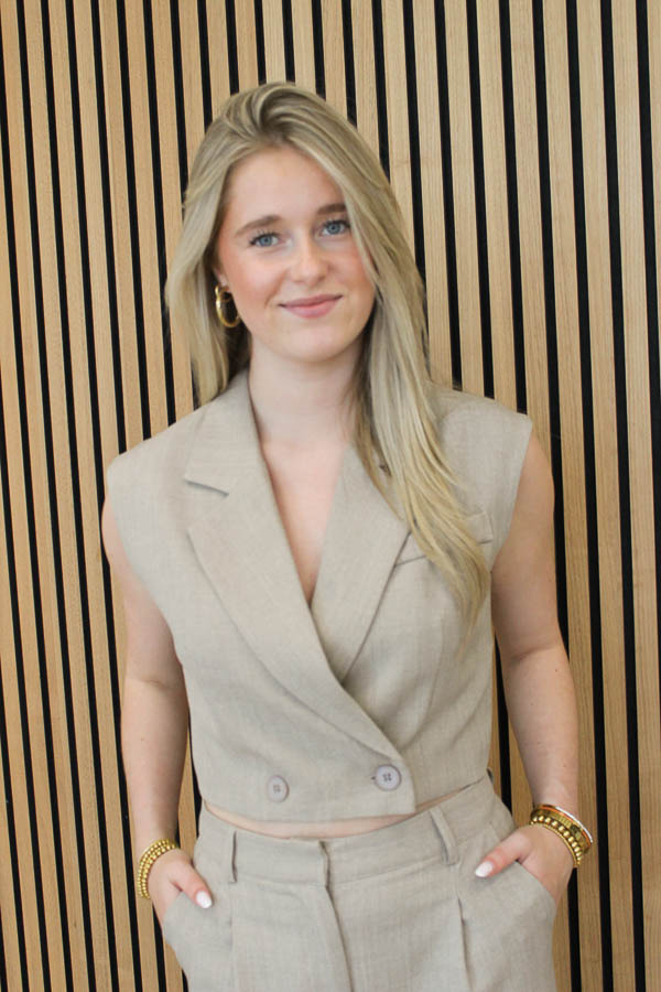 Gave cropped gilet die goed aansluit en super leuk staat op een broek met hoge taille of een rok kan natuurlijk ook! Deze matcht perfect met de bijpassende pantalon Malou beige voor dames die het liever als set dragen!