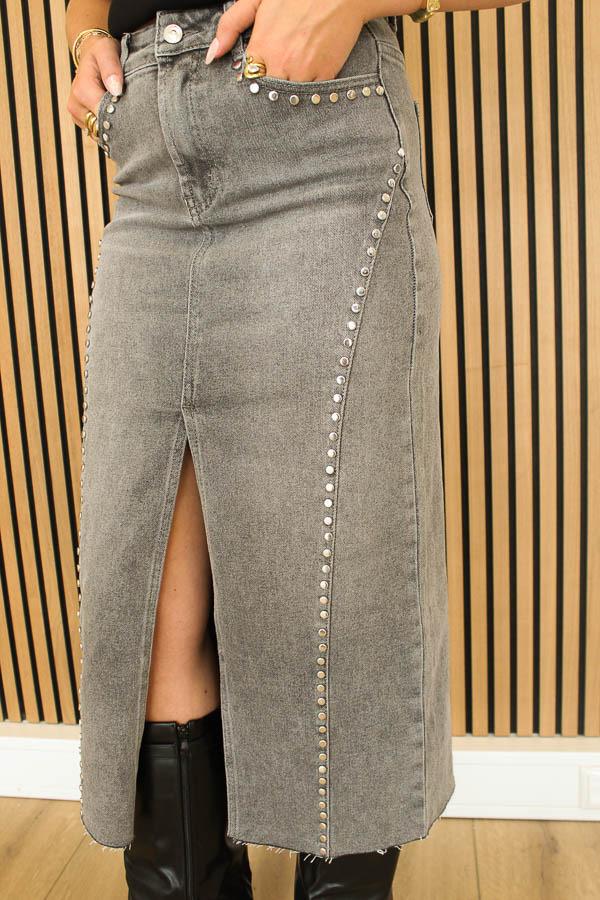 Een gave spijkerrok met stretch en hoge tailleband. Deze rok heeft knoop met ritssluiting en riemlussen. Rok heeft aan de voorkant een split en is voorzien van zilverkleurige studs. Super trendy voor fashionista's! Combineer deze rok met onze najaars tops of blouses voor een knallende outfit!