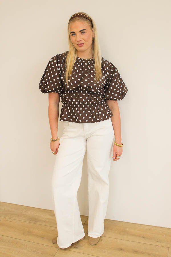 Deze stippen top in het bruin is een opvallende peplum top met polkadots. De top heeft een elastische band wat zorgt voor het peplum effect. Dankzij de speelse pofmouwen en witte stippen is dit echt een eyecatcher. Verkrijgbaar in meerdere kleuren en in onze winkel een favoriet!