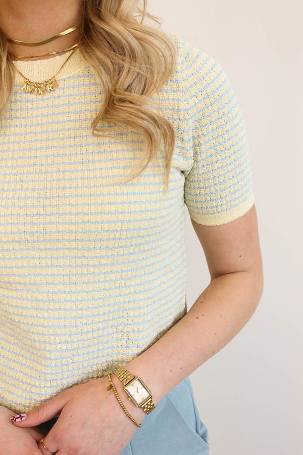 Een gebreide top met ronde hals en korte mouwen. Deze heeft fijngebreide stof en is in pastel geel met blauwe strepen.