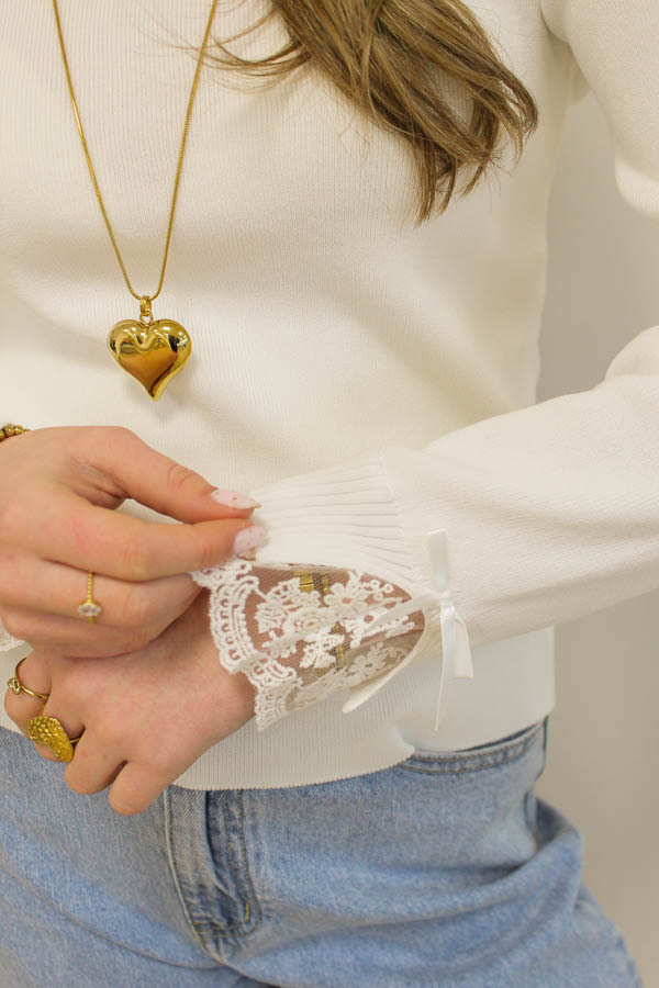Mooi fijngebreid truitje met elegante kanten details bij de mouwen voor een verfijnde uitstraling. Dankzij de stretch in de stof vormt het truitje zich mooi naar het lichaam en zit het comfortabel. Ideaal om zowel casual als chic te dragen.