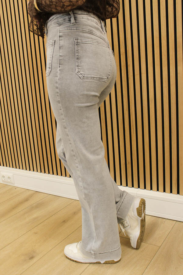 Deze highwaisted flared-wide jeans zit als gegoten dames! Hij sluit goed aan en heeft mooie zakken aan de voorkant en achter. Lekker veel stretch en grijs is toch echt wel een kleur die je mooi kunt combineren met de tops en vesten uit onze collectie!