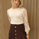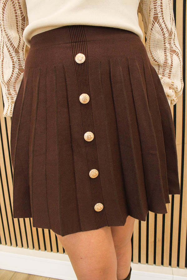 Gebreide rok met elastische tailleband, plisse én sierlijke knopen. Deze rokjes verkopen wij heel erg goed in de winkel!