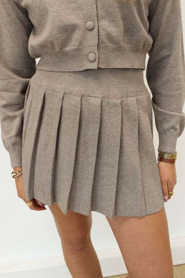Fijngebreide plisse rok met elastische tailleband. Deze rok heeft mooie bruine kleur met als set te combineren vest Sage. Leuk setje voor de herfst/winter! Bekijk ook onze laarzen voor een complete outfit!