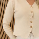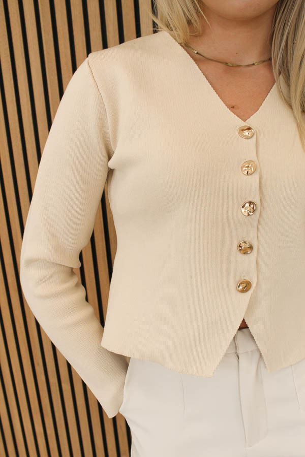 Fijngebreide top met v-hals en lange mouwen. Deze top heeft goudkleurige knopen én is fijn in dragen dankzij de viscose stof.