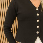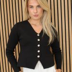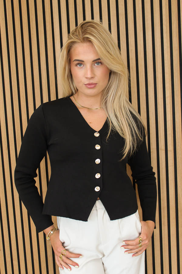 Fijngebreide top met v-hals en lange mouwen. Deze top heeft goudkleurige knopen én is fijn in dragen dankzij de viscose stof.