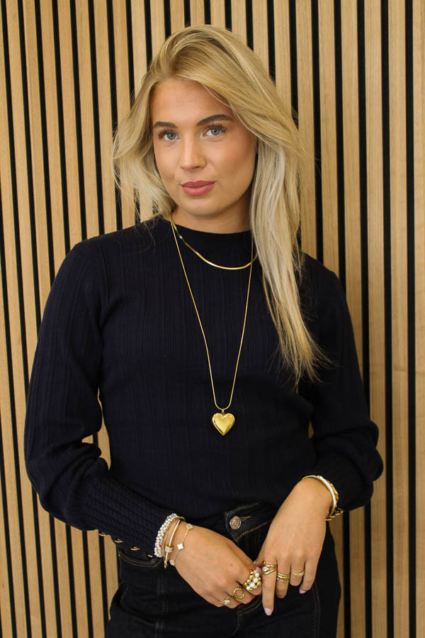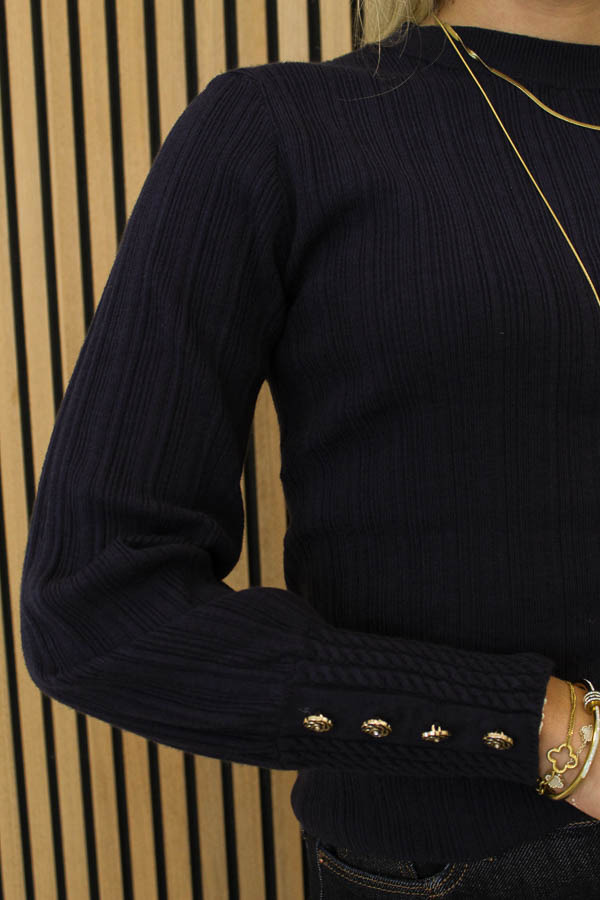 De perfecte basis voor in je kledingkast is deze top met fijne ribstructuur. De trui heeft een aansluitende pasvorm en lange mouwen. Ook heeft deze mooie sierknopen bij de mouwen. Combineer met een fijne broek of rok voor een comfortabele look!
