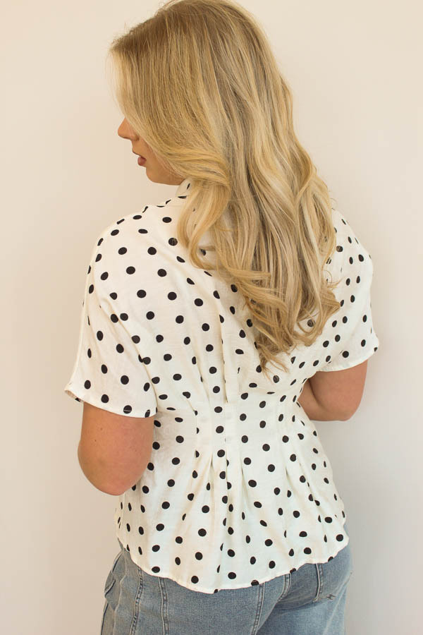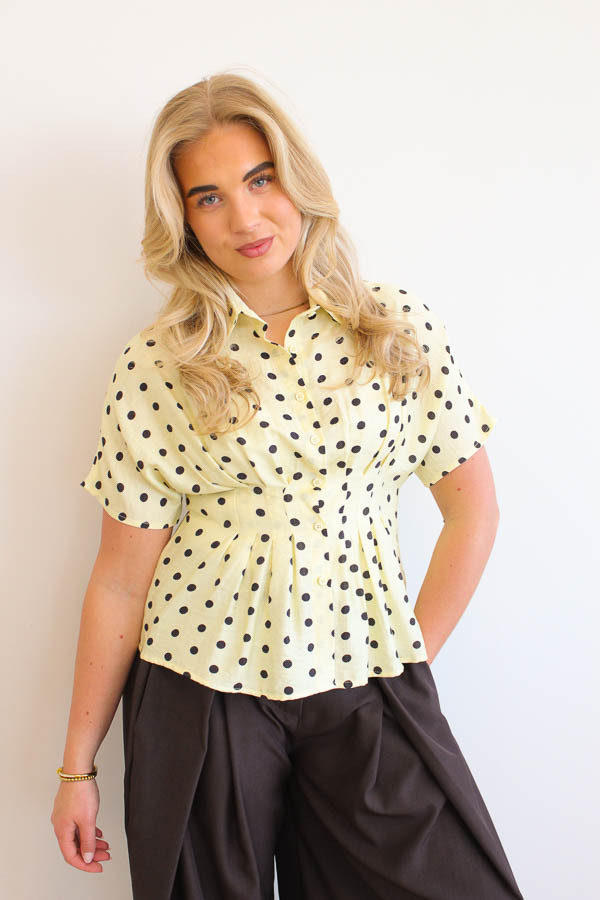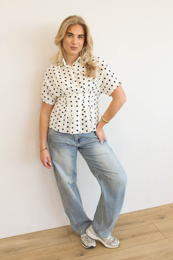 Shaped blouse met een speels stippenpatroon en een flatterende pasvorm. De blouse heeft korte mouwen en een knoopsluiting aan de voorkant. Gemaakt van luchtige viscose, waardoor hij comfortabel draagt en mooi valt.