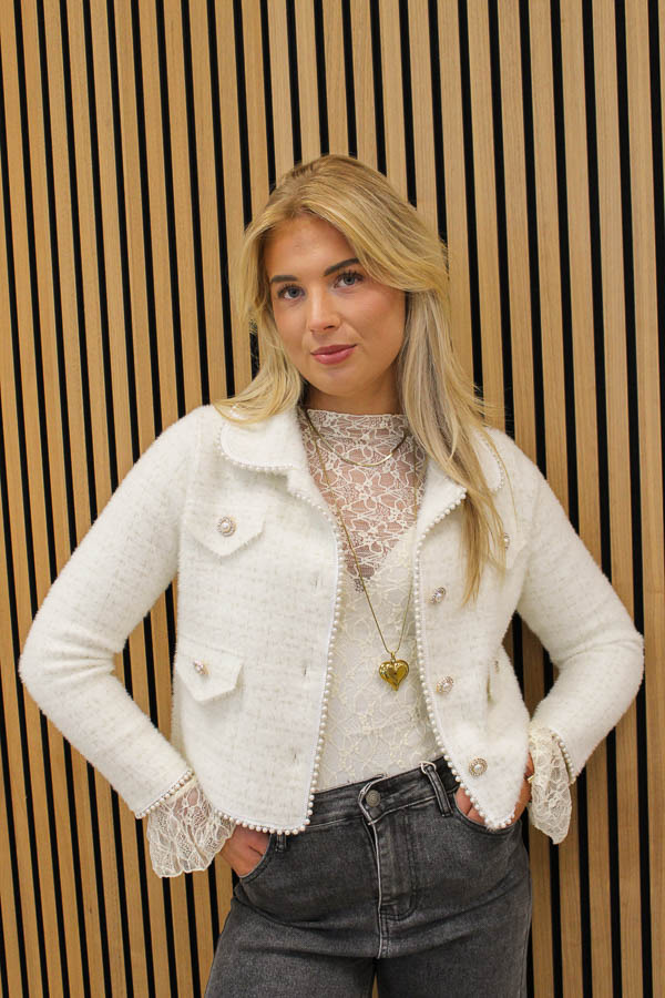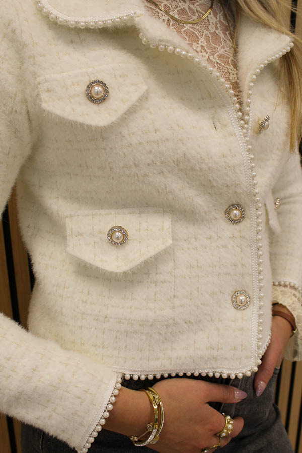 Een prachtige jasje met sierlijke parel knopen én strass. Deze is fijngebreid, lekker fluffy zacht (kriebelt niet) en voelt als een vest in dragen. Heel sjiek en stijlvol te combineren. Deze is van kwaliteit polyamide en blijft mooi!