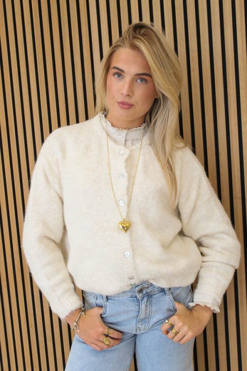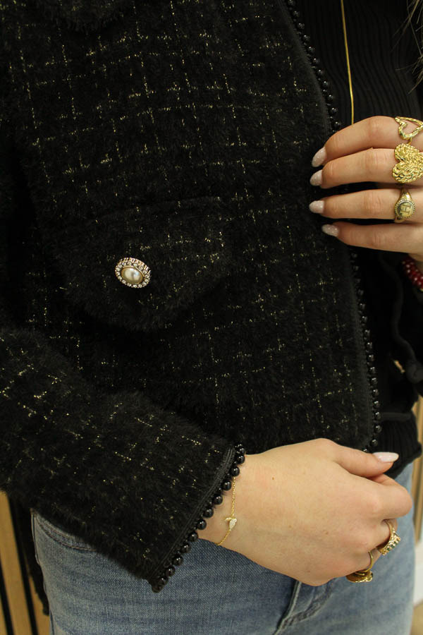 Een prachtige jasje met sierlijke parel knopen én strass. Deze is fijngebreid, lekker fluffy zacht (kriebelt niet) en voelt als een vest in dragen. Heel sjiek en stijlvol te combineren. Deze is van kwaliteit polyamide en blijft mooi!