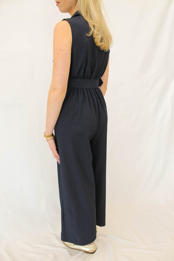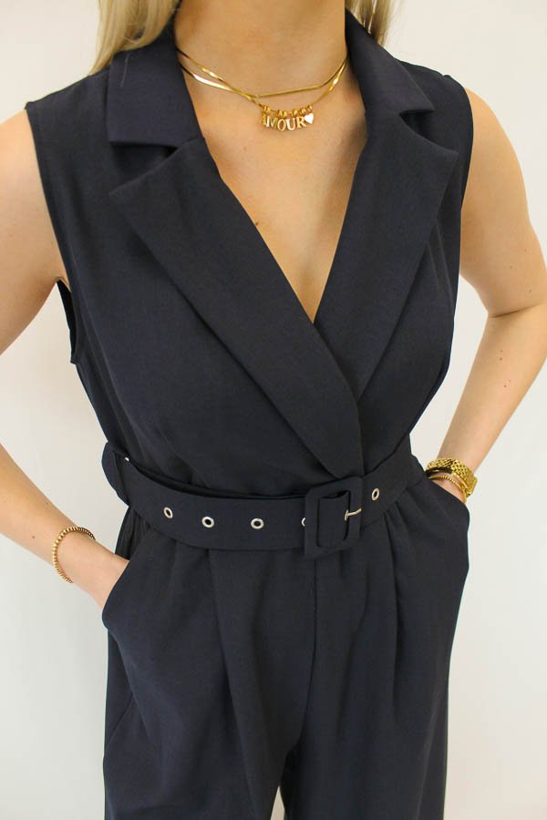 Een tijdloze must-have: deze navy jumpsuit straalt moeiteloze elegantie uit. De overslag V-hals en mouwloze snit geven een vrouwelijke touch, terwijl de wijde pijpen zorgen voor een moderne en flatterende pasvorm. De bijpassende ceintuur benadrukt de taille en creëert een mooi silhouet. Dankzij de luchtige, soepel vallende stof is deze jumpsuit niet alleen stijlvol, maar ook heerlijk comfortabel om te dragen. Perfect voor zowel een casual daglook als een chique gelegenheid.