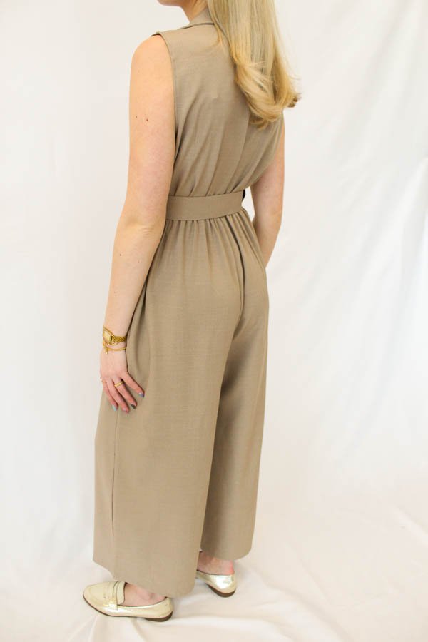 Een tijdloze must-have: deze zandkleurige jumpsuit straalt moeiteloze elegantie uit. De overslag V-hals en mouwloze snit geven een vrouwelijke touch, terwijl de wijde pijpen zorgen voor een moderne en flatterende pasvorm. De bijpassende ceintuur benadrukt de taille en creëert een mooi silhouet. Dankzij de luchtige, soepel vallende stof is deze jumpsuit niet alleen stijlvol, maar ook heerlijk comfortabel om te dragen. Perfect voor zowel een casual daglook als een chique gelegenheid.