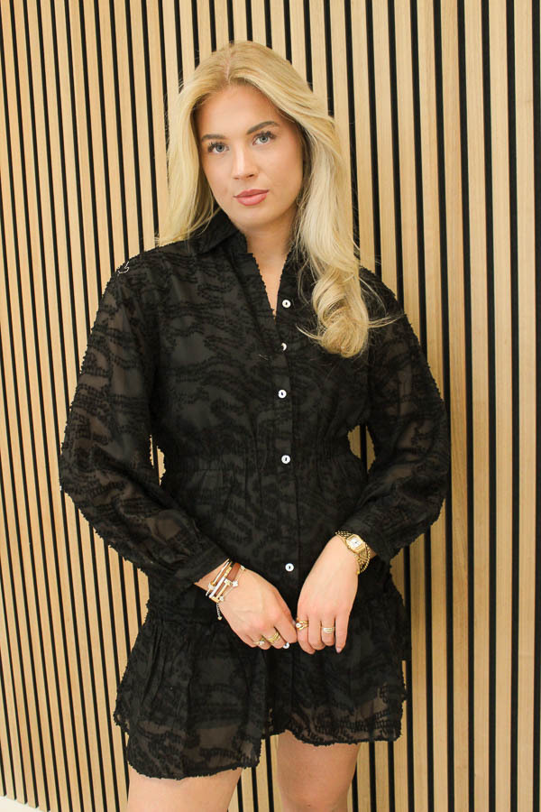 Jurk met v-hals en lange mouwen. Deze jurk heeft elastische tailleband met sieroverslag. Deze valt dus niet open. Jurk heeft