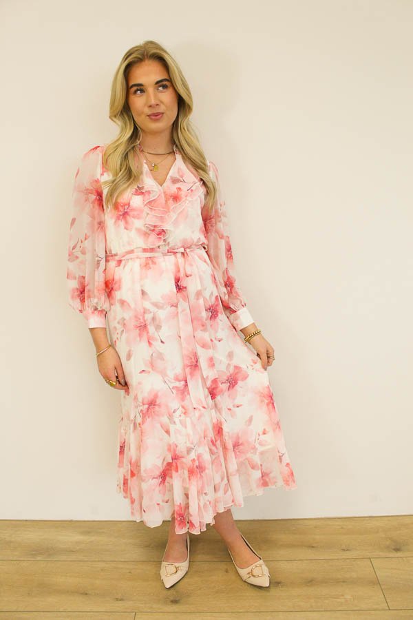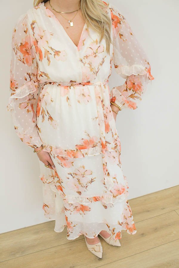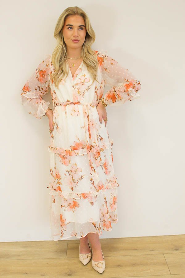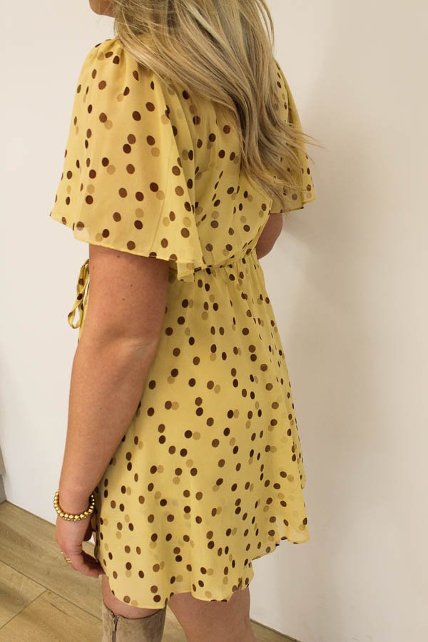 Een mooie jurk in een warme honingkleur met bruine stippen voor een speelse uitstraling. De jurk heeft een elegante V-hals en korte mouwen. Perfect voor een frisse en stijlvolle look.