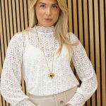Kanten top met hoge kraag en lange mouwen. Deze top heeft een zachte stretch stof met kant en de mouwen die iets poffen. Erg mooi en sjiek te combineren met een pantalon of rok!