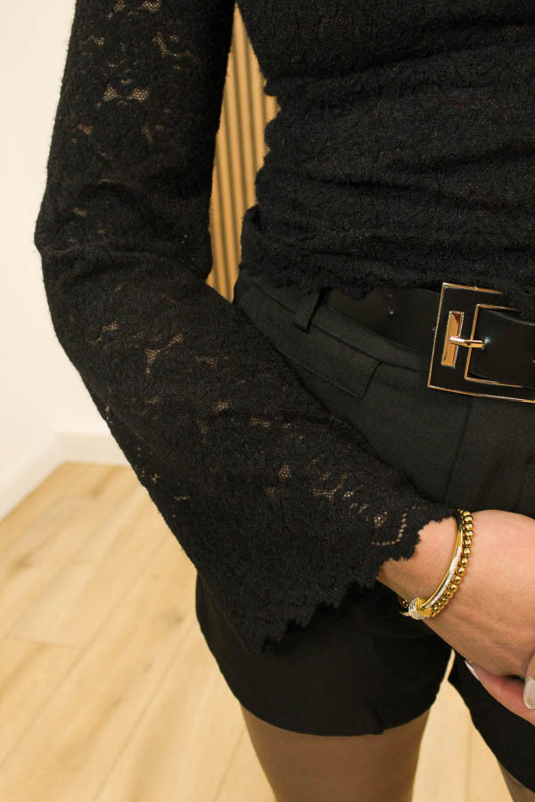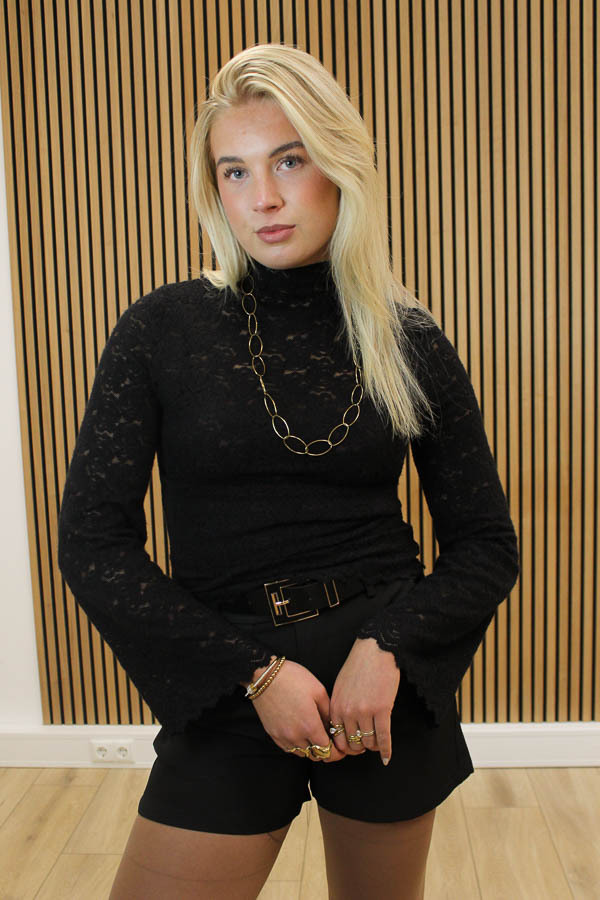 Kanten top met hoge hals en uitlopende mouwen. Deze is transparant en perfect te combineren voor een feestelijke look! Verkrijgbaar in meerdere kleuren!