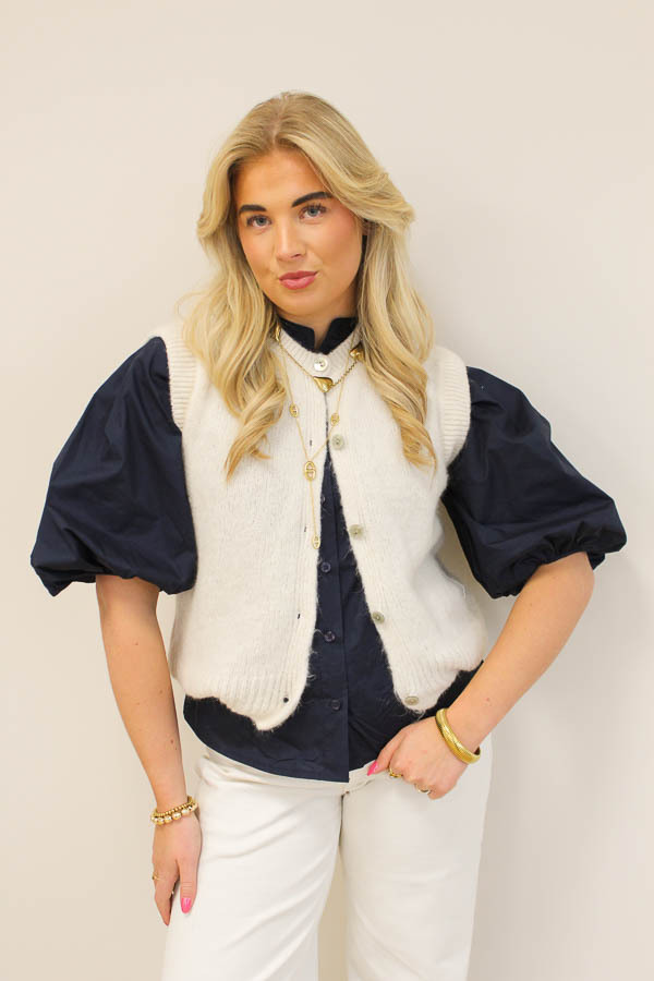 Een gebreide zachte gilet met knopen. Deze is perfect te combineren met onze blouses én kanten tops. Je shopt ze in verschillende kleuren!
