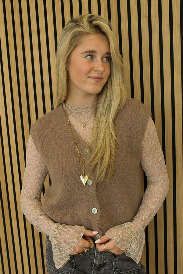 Een gebreide zachte gilet met knopen. Deze is perfect te combineren met onze blouses én kanten tops. Je shopt ze in verschillende kleuren!