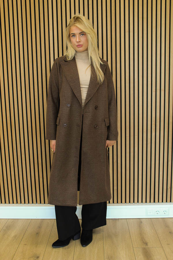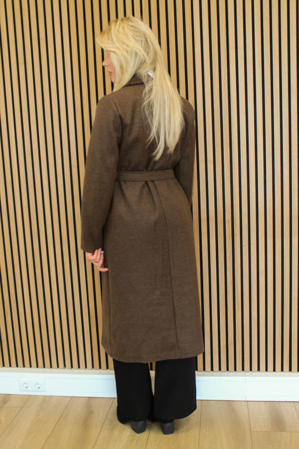 Een lange mantel jas in de trendkleur bruin met ceintuur. Deze jas voelt lekker zacht en comfortabel in dragen. Een bestseller uit onze winkel!