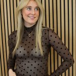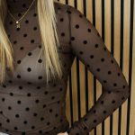 Een mesh top met hoge hals en lange mouwen. Deze heeft bekende polka dots stippen print. Verkrijgbaar in verschillende kleuren en helemaal een trend!