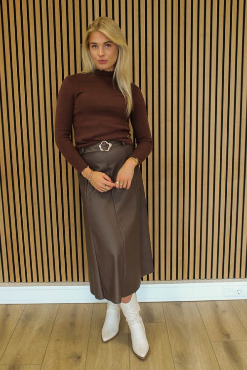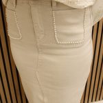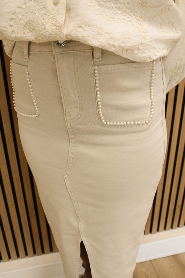 Deze midi beige spijkerrok zit erg comfy dankzij de stretch. Rok heeft een knoop met rits en een split aan de voorkant met parel details.