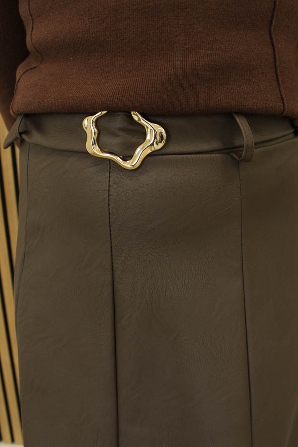Een leerlook rok met elastische tailleband met lichte stretch in midi lengte. Deze rok heeft een mooie riem met goudkleurige gesp. Deze rok valt goed op maat. Een bestseller van onze winkel.