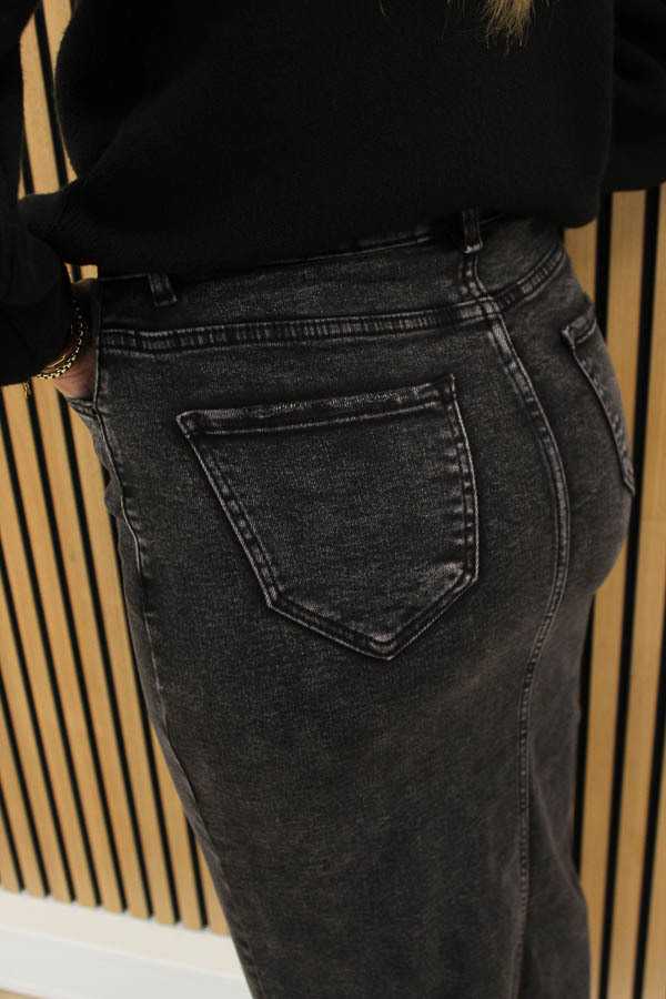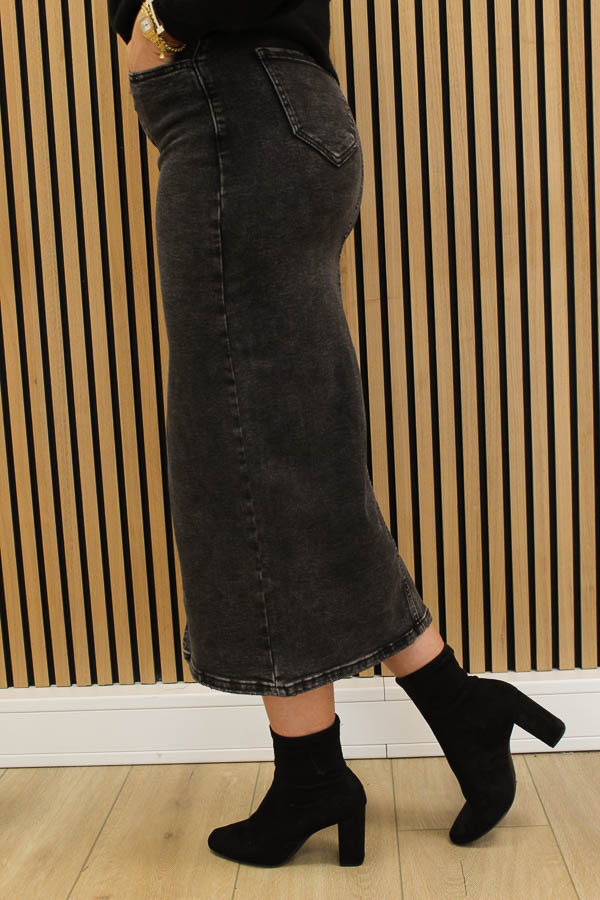 Een spijkerrok in midi lengte met stretch en split aan de voorkant. Deze rok zit heerlijk comfy en is helemaal van deze trend! Verkrijgbaar in Zwart en Denim Blauw.