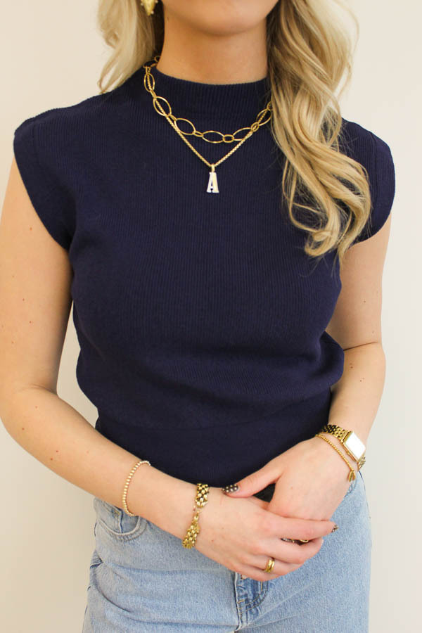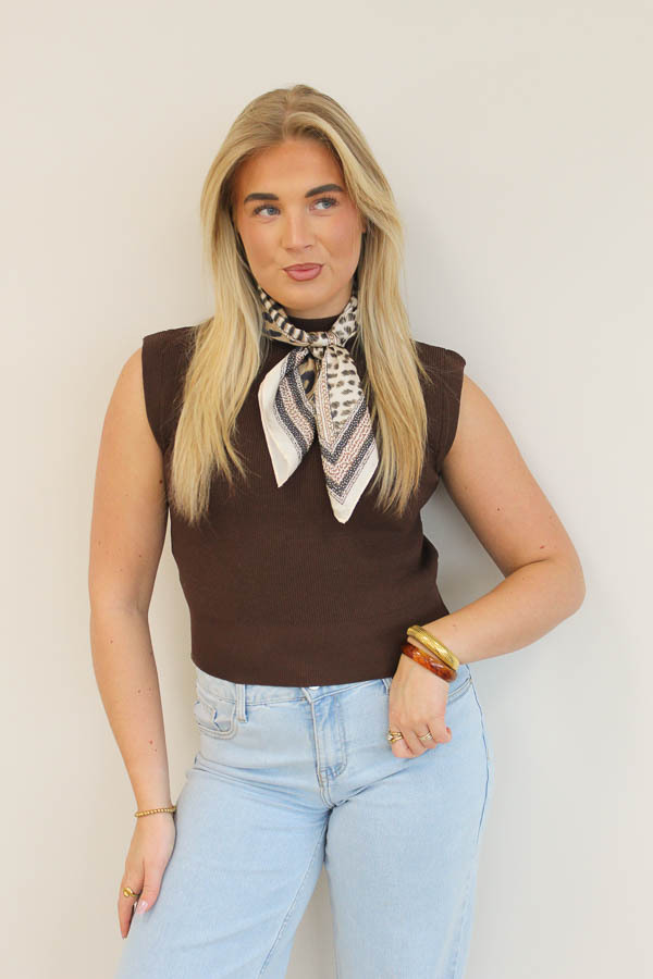 Een mouwloze, gebreide top van ons eigen label met een elegante hoge hals voor een stijlvolle uitstraling. De fijne knit zorgt voor een comfortabele en mooie aansluitende pasvorm. Perfect om onder een blazer te dragen of juist solo voor een minimalistische, chique look.