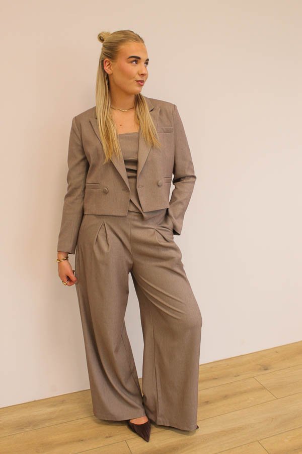 Eendelige pantalon met een elegante wide leg pasvorm. De broek heeft geen sluiting en een elastische band aan de achterkant in de rug voor extra comfort. Met een plooi aan de voorkant voor een nette uitstraling. Shop het gehele pak voor een complete en stijlvolle look.