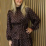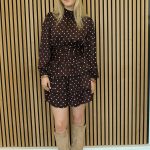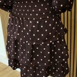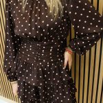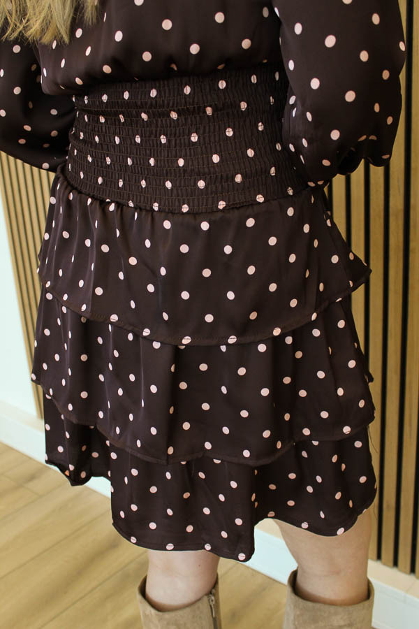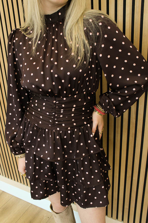 Deze jurk is mooi burgundy bruin-bordeaux kleur warme tint met pofmouwen én elastische tailleband, en ruffel onderkant. De luchtige stof beweegt sierlijk met je mee. Deze polka dot print is helemaal een trend!
