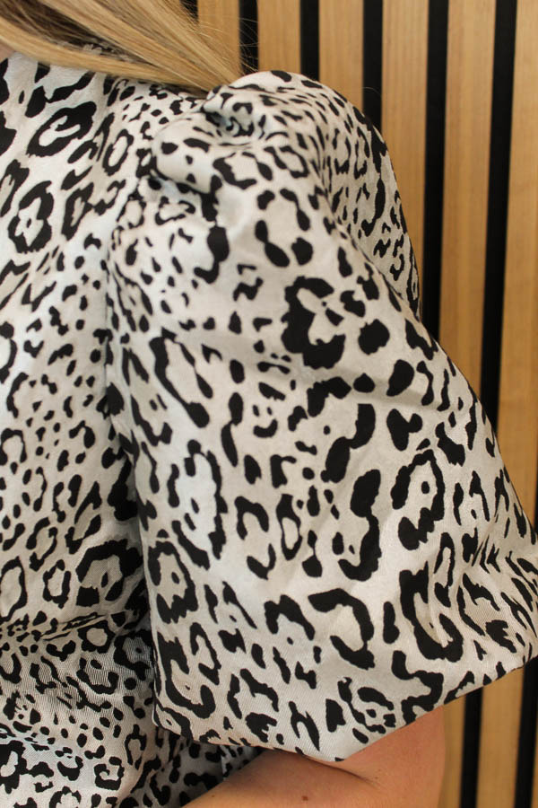 Musthave! Deze trendy blouse heeft een ronde hals, korte mouwen, knoopsluiting, non-stretch stof en een regular fit. Verder wordt de blouse gekenmerkt door de grijze kleur en de pof mouwen. Het opvallende panterprint patroon maakt dit kledingstuk uniek en stijlvol. De blouse is gemaakt van polyester, hierdoor is het sterk van kwaliteit en vormvast.