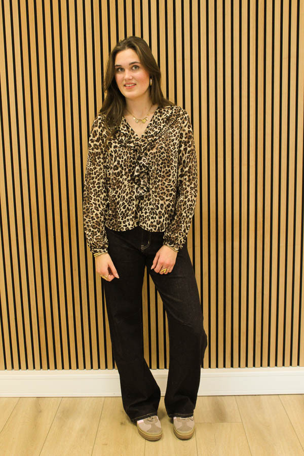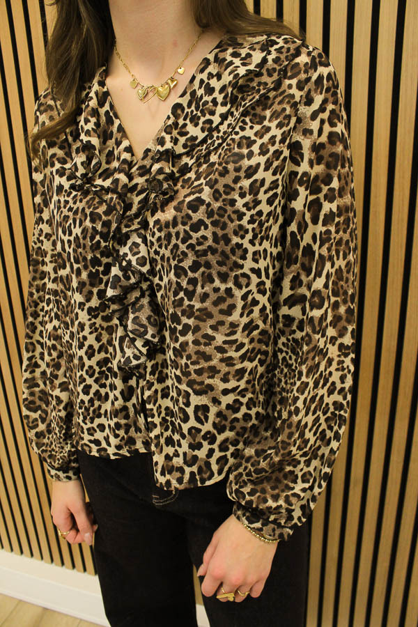 Blouse met v-hals en lange mouwen. Deze blouse heeft panterprint en een ruffelkraag.