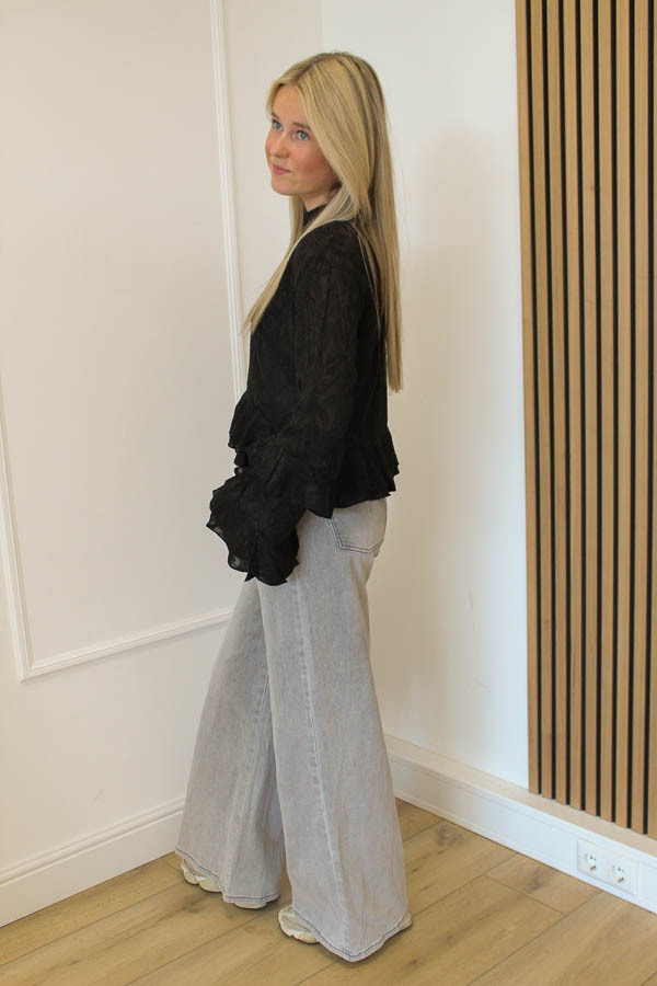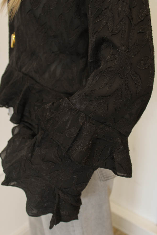 Trompetmouw, hoge hals, chique stof, trendy én stylish, blouse top.