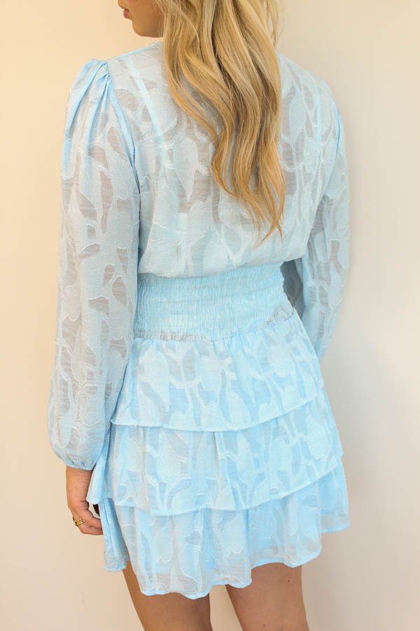 Een mooie jurk met een getailleerde taille die zorgt voor een vrouwelijke pasvorm. De jurk heeft lange mouwen, een ruffelrok en een elegante hoge hals. Gemaakt van een luchtige stof voor een comfortabele en stijlvolle uitstraling.