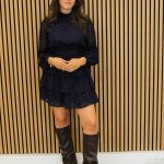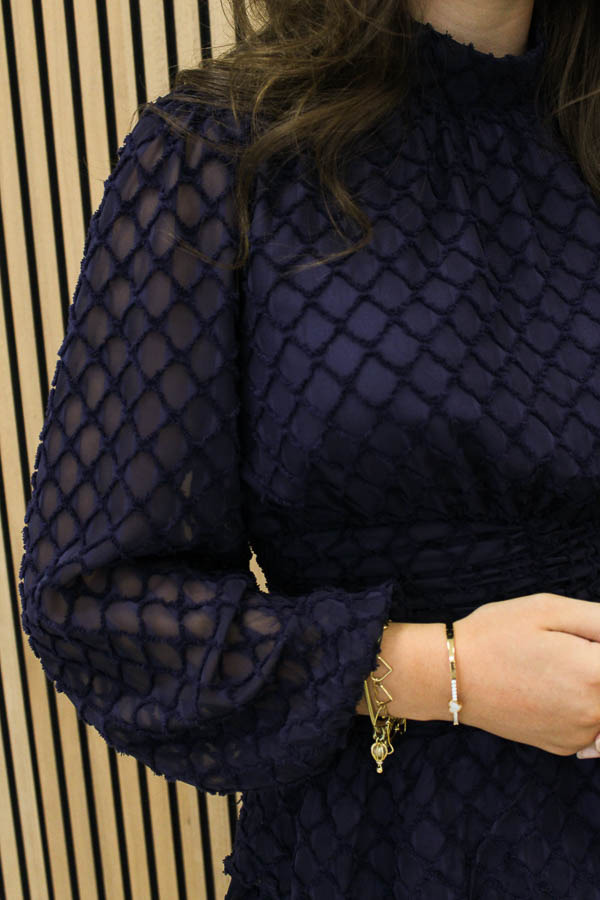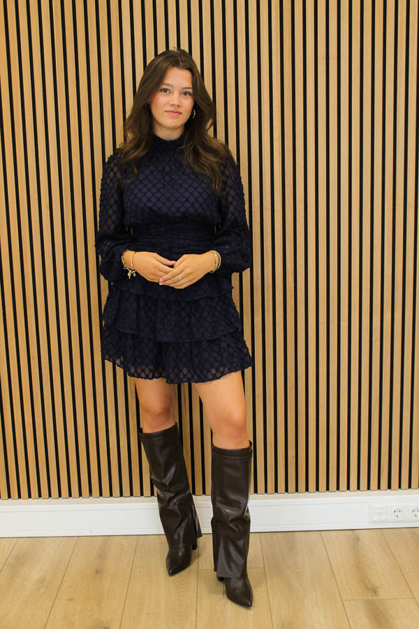 Jurk in chocolade bruin met ruffles en hoge hals en knoopsluiting in de nek. Deze jurk heeft elastische tailleband en lange pof mouwen. Verkrijgbaar in meerdere kleuren. Bekijk ze online!