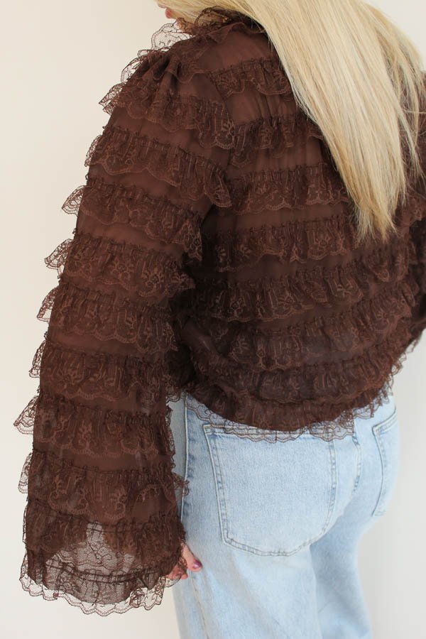 Geweldige ruffel blouse die licht doorschijnt voor een elegante uitstraling. De blouse heeft kanten ruffels, uitlopende mouwen en een losse fit. Verkrijgbaar in one size en perfect voor een stijlvolle, vrouwelijke look.