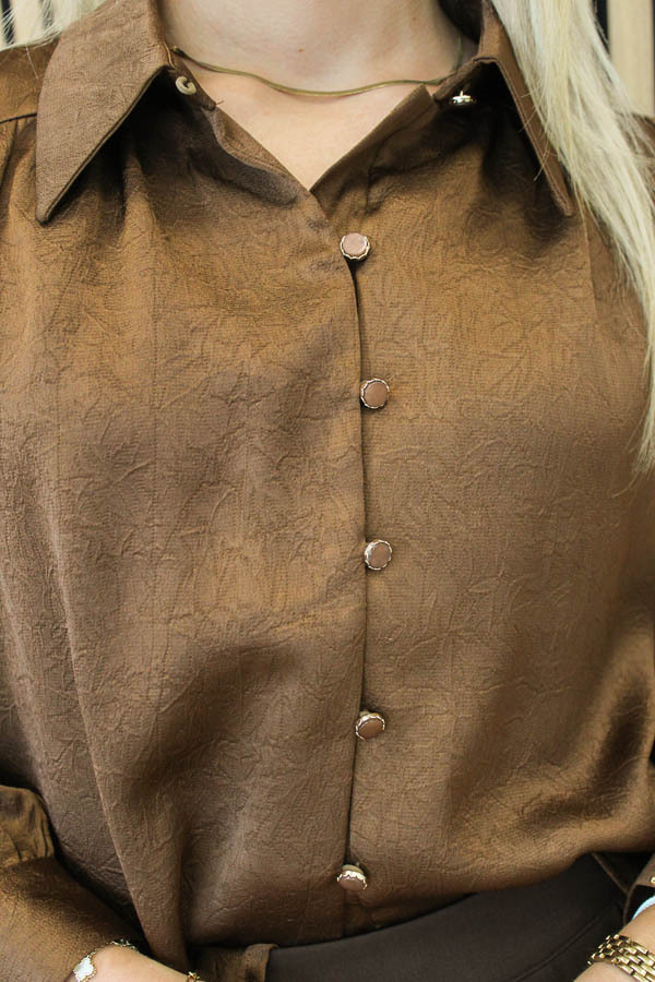 Een elegante blouse in satijnlook (niet te glanzend) prachtig mooie knopen en in trend kleur bruin. Deze blouse is ook verkrijgbaar in khaki groen. Perfect te combineren met een hoge taille rok of pantalon.